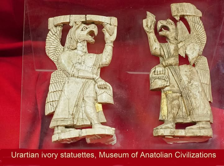 این مجسمههای عاجی از محوطه باستانی آلتین تپه (Altıntepe) در شرق ترکیه به دست آمده و امروزه در موزیم تمدنهای آناتولی، آنکارا نگهداری می شوند. این آثار نه تنها نشانگر مهارت هنری اورارتوئیان در تراش عاج استند، بلکه جلوه ئی از باورهای دینی و نمادگرائی آئینی آنان را نیز آشکار می سازند.