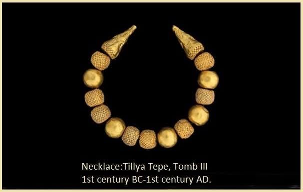 این گردنبند طلائی باشکوه، یکی از آثار برجستهٔ باستان شناسی افغانستان، در جریان کاوشهای سالهای ۱۹۷۸ تا ۱۹۷۹ میلادی توسط هیئت مشترک افغان-شوروی، از گور شمارهٔ III (سوم) در محوطهٔ باستانی «طلا تپه» (Tillya Tepe) در ولایت جوزجان (شمال افغانستان) کشف شد.