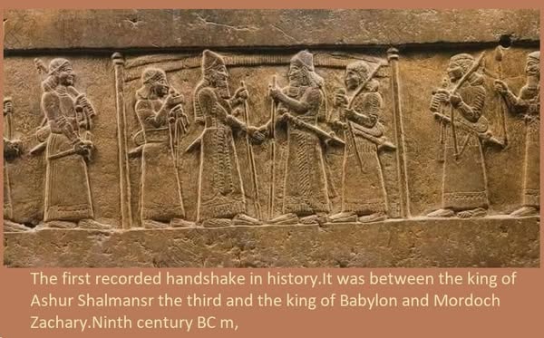همانطوری که شواهد تأریخی نشان می دهد، آشوریان از نخستین ملت هائی بودند که حدود ۳۰۰۰ سال پیش از دست دادن به عنوان آئین خوشآمدگوئی و احترام استفاده می کردند.