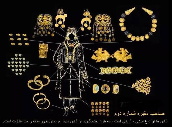 در این تصویر، نوعیت، کمیت و کاربرد زیورات طلائی متعلق به بانوئی اشرافی، احتمالاً یک شاهزاده خانم کوشانی حدوداً چهل ساله، مشاهده می شود. این بانو در آرامگاه شمارهٔ (۲) از محوطهٔ باستانی طلا تپه، واقع در ولایت جوزجان در شمال افغانستان امروزی ( آریانای کهن)، مدفون بوده است.