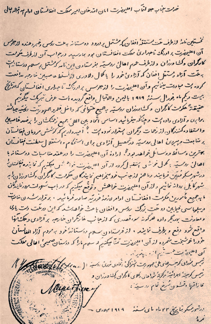 نخستین نامه ء از طرف ملت مستقلۀ افغان که مشتمل بر درود دوستانه به ملت روس و خبردهنده از جلوس آن اعلیحضرت بر اورنگ تاجداری مملکت افغانستان بما رسید. در جواب آن از طریق حکومت کارگران و کشاورزان و از طرف عموم اهالی روسیه بفرستادن این نامه که مشتمل بر سلام دوستانه است، به ملت آزاد و مستقل افغان که آزادی خود را با کمال دلاوری از تسلط غاصبین خارجه مدافعت کرده است مبادرت مینمائیم و آن اعلیحضرت را از جلوس بر ارونگ تاجداری افغانستان که در تأریخ بیست و یکم ماه فورال سنه ۱۹۱۹ بالیمن و الاقبال واقع گردیده است عرض تبریک میگوئیم.