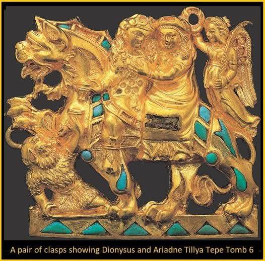 - یک جفت گیره یا سنجاق طلائی (۶٫۵ × ۷٫۰ سانتی متر)، مزین به نگینهای فیروزه ای و نقوش برجسته، که در آن ها چهرههای اسطوره ای یونانی چون دیونیسوس (ایزد شراب و حاصل خیزی) و همسرش آریادنه (فرزند شاه مینوس) به وضوح دیده می شود.