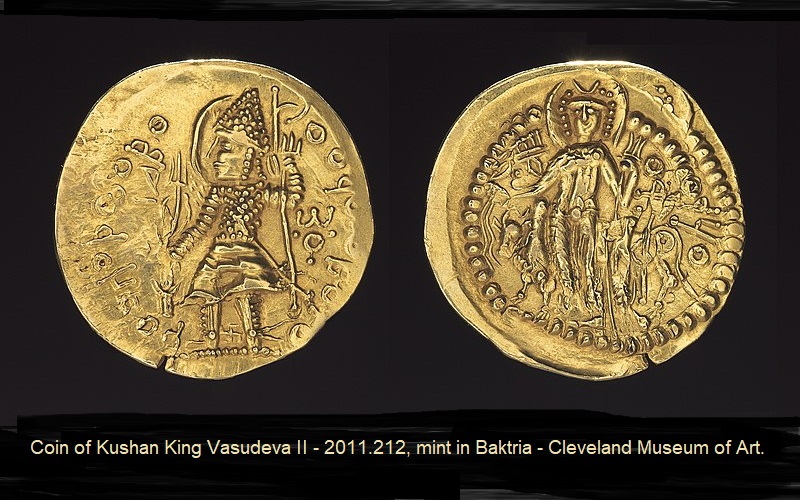 واسودووا دوم ( Vasudeva II ۲۷۰-۳۰۰م )، یکی از امپراتور ها سلسله کوشانیان ، که احتمالاً او جانشین کانیشکا سوم بوده و باحتمال عالب که امپراتوری به نام شاکا کوشان جانشین او شد.این سکه در باکتریا « بمرکزیت بلخ». ضرب زده شده و طوریکه دیده میشود، واسودووا ، رو به سمت چپ ایستاده، نیزه سه شاخه را در دست دارد، بر بالای محراب به سمت چپ قربانی میکند و نماد سواستیکا « صلیب شکسته» نیز در بین پاهای او قرار دارد.