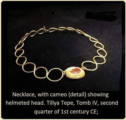این گردن بند طلائی ارزشمند از گنجینهٔ باختر (Bactrian Gold) است که نگین آن با یک کَمیو (Cameo) تزئین شده و بر روی آن نیم رخ شخصیتی با کلاه خود (احتمالاً یکی از اعضای خاندان سلطنتی یونانی-باختری) نقش بسته است.