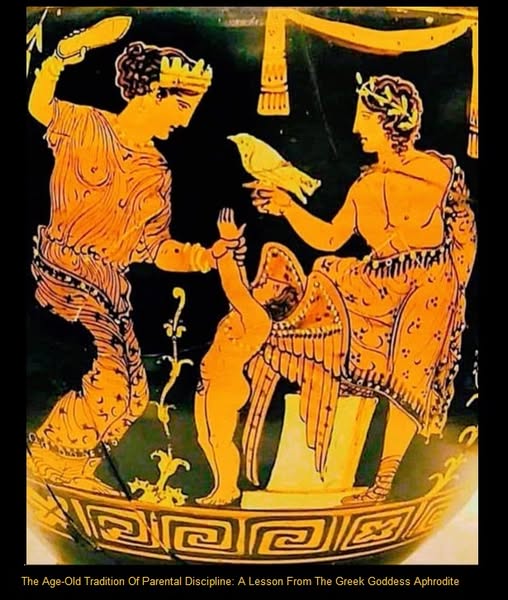 همانطوریکه درآثار هنری و تأریخی بجا مانده از یونان باستان دیده میشود، در یکی ازین آثار فرودیت ( Aphrodite =الهه زیبائی) بتصویر کشیده شده، که او پسر سرکش اش بنام اروس (Eros = خدای عشق ) را با دمپائی اش تنبیه و او را تهدید به انضباط پذیری می کند. این نقش تأریخی که در حدود (۳۶۰) سال قبل از میلاد، خلق شده، بخشی از یک استامنوس « گلدان سفالی یونانی» میباشد، که در منطقه تارانتاس (Tarantas) ، مستعمره اسپق اسپارت ها در جنوب ایتالیا، یعنی در شهر تارانتوی امروزی یافت شده، که اکنون در موزیم (MArTA ) در تارانتو ایتالیا نگهداری می شود.