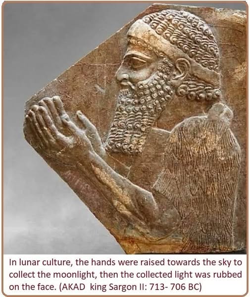 لوح نقش برجسته ذیل آشوری، متعلق به قرن نهم قبل از میلاد بوده، که مردی را در حال انجام دعای « مغفرت و بخشش» نشان میدهد. آنهم طوری که دستانش را بسوی آسمان، یعنی بطرف خدای سین (Sin = خدای ماه ) بلند کرده است. البته در این دعا، پیروان فرهنگ « دین» و خدای ماه پرستی، درآشور دستان خود را طوری بسوی آسمان بلند می کردند، تا بتوانند که کف دستان خود را از نور خدای ماه ( سین) پر کنند و بعد آن نور را به صورت شان بمالند.