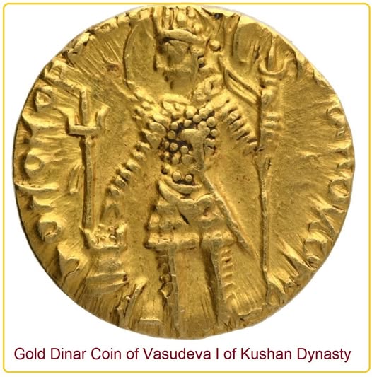 گفتنیست، که واسودِوا یکم واپسین پادشاه نیرومند و مستقل کوشانیان بود که توانست سلطهٔ فرهنگی و مذهبی امپراتوری کوشانی را تثبیت کند. در دورهٔ او، دینارهای طلا به صورت گسترده و باشکوه ضرب می شدند، که در این سکه ها تصاویر ترکیبی از عناصر آریائی (شعله، لباس سلطنتی)، مفاهیم هندی (تریشولا، نذر)، و سبک یونانی-باختری (خط، ترکیب بندی پیکر) بر آن ها نقش می بست.