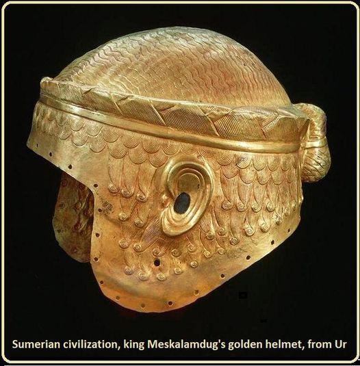 این کلاه ایمنی طلائی، که متعلق به مسکلآمدوگ (Meskalamdug = قهرمان سرزمین مبارک) پادشاه اولیه سومر - اور ، از سلسله اول اور بوده، که در حدود ( ۲۶۰۰ ) سال قبل از میلاد میزیسته، در سال (۱۹۲۴) میلادی، توسط سر لئونارد وولیLeonard Woolley، باستان شناس بریتانیائی در جریان حفاری هائی از گورستان سلطنتی « اور » در عراق امروزی کشف گردیده است.