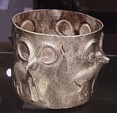 این جام استوانه ئی با ارتفاع ۱۲ - ۱۳ سانتیمتر، ساخته شده از نقره ناب، مربوط به اواخر هزاره سوم تا اوایل هزاره دوم پیش از میلاد (حدود ۲۲۰۰–۱۵۰۰ ق م) است. این اثر یکی از نمونههای ممتاز فرهنگ باختری–محرمانه آمو " با محل نامعلوم کشف" (Bactria–Margiana Archaeological Complex) در آسیای مرکزی است .