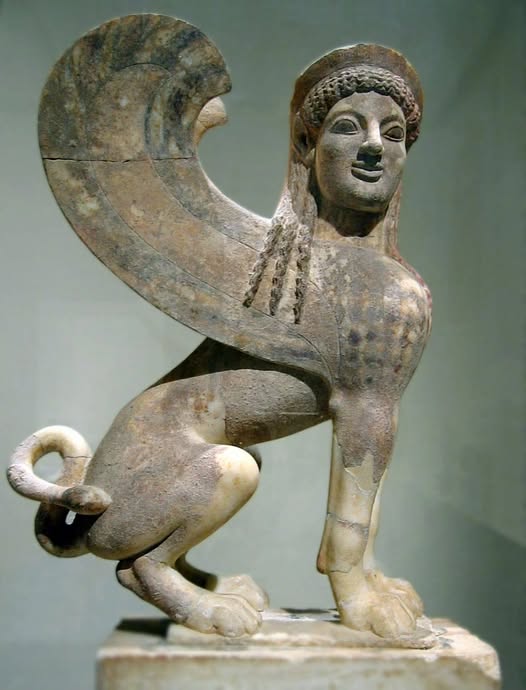 همچنان قابل یاد آوریست، که ابوالهولهای یونانی با کلاه. Kausia، برخلاف نمونههای مصری، معمولاً مونث استند و در نقش نگهبانان آرامگاه ها، زیارتگاه ها یا درگاههای آئینی ظاهر می شوند. سبک این تندیس، به وضوح از ویژگیهای آرکائیک یونانی پیروی می کند، با لبخند خاص معروف به "لبخند آرکائیک"، مدل موهای گل وار و ترکیب نمادهای حیوانی و انسانی میباشد.