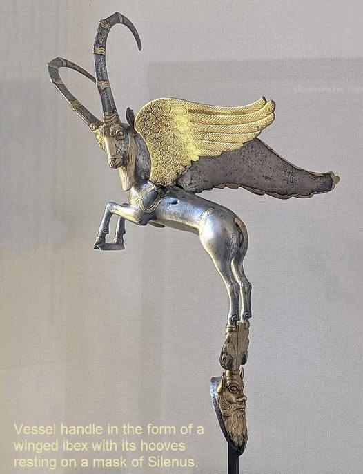 آن به قرن چهارم میلادی حدودا بسالهای۳۰۰ تا ۳۷۰ میلادی میرسد، بخشی از یک جام آئینی (احتمالاً ریتون) بوده و به عنوان یکی از نمونههای درخشان هنر فلزکاری در اواخر دورهٔ کلاسیک شناخته می شود. دستهٔ جام به شکل بز کوهی بالدار (شیر دال یا ایبکس اسطوره ئی) طراحی شده که در حال پرش است و سُمهای عقبی اش را بر چهره یا نقاب یک مرد گذاشته است؛ چهره ئی که به وضوح نمایانگر سیلنوس (Silenus)، ایزد پیر و مستی در اساطیر یونان و همراه همیشگی دیونیسوس، خدای شراب، است.