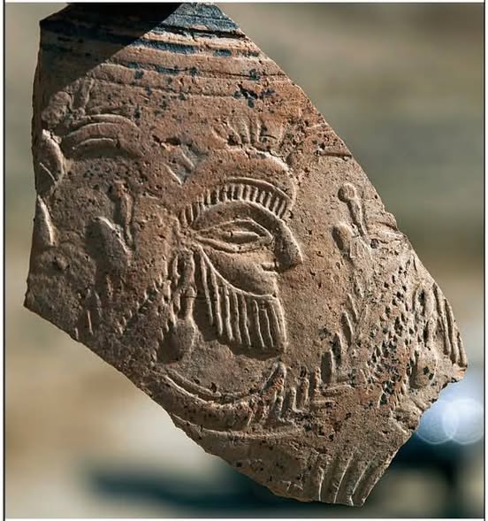 2. پاره سفال دوم: چهره مردی با ریش بلند و تاج مانند نقش شده است. خطوط تاج و آرایش ریش به وضوح نشانگر شأن دینی یا حکومتی فرد است. در هنر کوشانی و یفتلی، چنین پرتره هائی غالباً به پادشاهان، شاهزادگان یا شخصیتهای روحانی تعلق دارد.