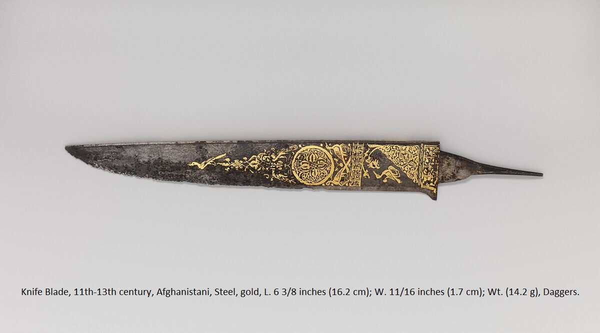 تیغه چاقو فولادی، با تزیینات « ریخته شده طلائی» بر روی آن نشان می دهد، که این تیغ متعلق به نوع کوچکی از چاقوهای تزئین شده مشابه بوه است. این چاقو در قرن « یازدهم تا سیزدهم »، ساخته شده است. طوریکه بر اساس سبک تزئین شده آن، ساخت این چاقو به زمان حکومات سلسلههای امپراتوری غزنویان یا غوریان نسبت داده شده ، که به ترتیب در آن زمان بر سرزمینهای « پارس، آسیای میانه، شبه قاره هند و غرب چین » نیز حکومت می نمودند.