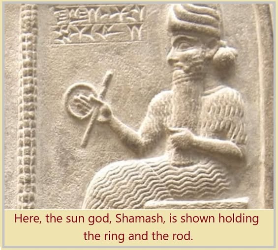 در بسیاری از حکاکی ها و کنده کاریهای سومری، پادشاه یا یکی از خدایان را می بینید، که چیزی را در دست دارد، که از آن به عنوان میله و حلقه ( The Rod and the Ring) یاد می شود.
