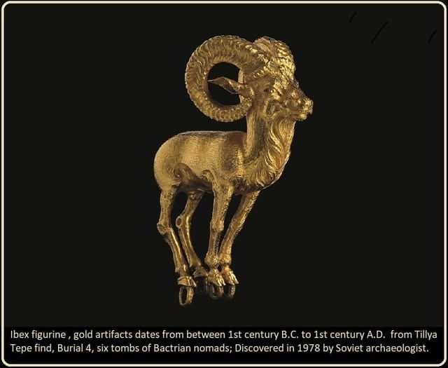 مجسمه طلائی قوچ کوهی « بزکوهی »، که در حدود دو هزار سال قدمت دارد ، احتمالآ در « قرن اول قبل از میلاد، یا در قرن اول پس از میلاد» ساخته شده است. این اثر تأریخی درجریان حفاریهای سالهای ( ۱۹۷۸ تا ۱۹۷۹م) از گور شماره چهارم سایت باستانی طلا تپه ولایت جوزجان، که مربوط بیک سردار جنگی محلی و با لباسهای گشاد بوده ، کشف گردیده است
