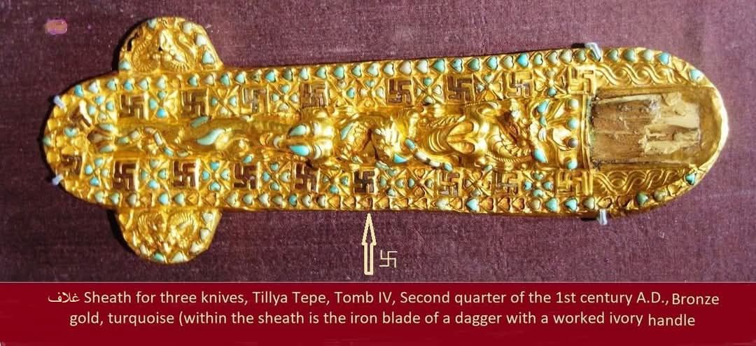 یکی از برجسته ترین ویژگیهای تزئینی این غلاف، کاربرد مکرر نماد صلیب شکسته یا «سَواستیکا» (卐) است؛ نمادی که در فرهنگهای باستانی آسیای مرکزی چون سرزمین آریانا و جنوب آسیا، جایگاه مقدس و آئینی داشته است.