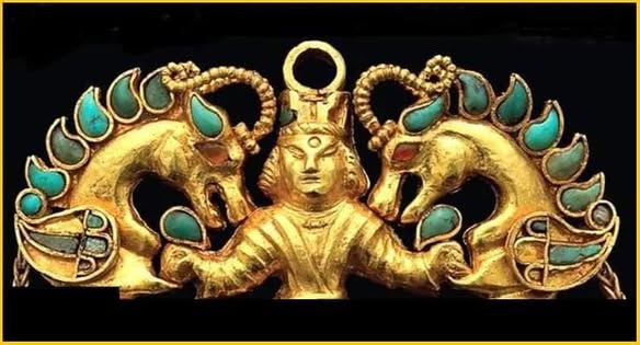 یک جفت آویزه طلائی با ابعاد ( ۱۲،۵۱ × ۶،۵) سانتی متر، تزئین شده با نگینهای « فیروزه، گارنت، لاجورد، کارنلین و مروارید» با تصویر ایزد اژدها و با موهای تزئین شده بطور استادانه و ملبس با کرتی کوتاه (tunic) و تنبان گشاد، شبیه لباسهای معمول عشایر سکائی ، در حالی که او دو موجود « اژدها مانند » را در پنجه هایش گرفته و در جلو اش نگه داشته است.