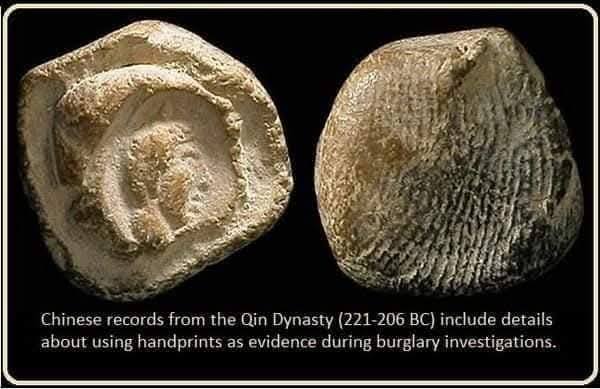 در آثار سفالی برجای مانده از سلسله چین (Qin, ۲۲۱–۲۰۶ ق.م)، شواهدی مبنی بر استفاده از اثر دست به عنوان مدرک در تحقیقات جرایم سرقت وجود دارد.