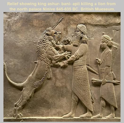 نقش برجسته گچی آشوربانیپال Ashurbanipal( ۶۳۱ - ۶۶۹ م ق) ، پادشاه بزرگ آشوری،که خود را شاه شاهان جهان میخواند، در حال شکار شیر بتصویر کشیده شده، از کاخ شمالی نینوا Nineveh ( در عراق امروزی) کشف گردیده، در سال ( ۶۴۵ ق م) ساخته شده است.