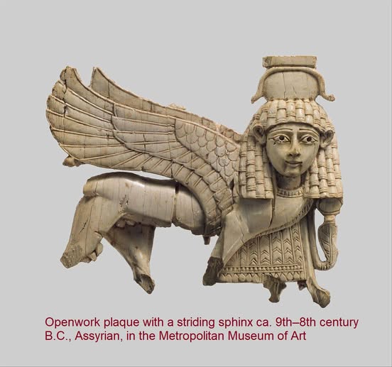 پلاک حکاکی شده یک ابوالهول، که در حال گام برداشتن است، این اثر از شهر نمرود باستان در بین النهرین کشف شده است.