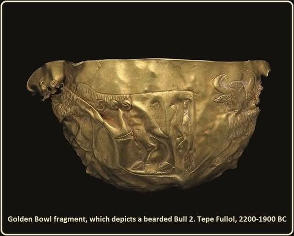 این قطعهٔ زرین، بخشی از یک کاسهٔ طلائی باستانی است که با نقوش برجسته ئی از دو گاو نر ریش دار (با چهره هائی شبیه انسان)، گرگ و مار تزئین شده است؛ نمادهائی که در اسطوره ها و فرهنگ آریائیان جایگاه ویژه ئی دارند.