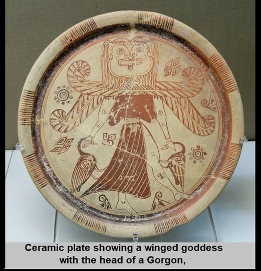بشقاب سفالی، با تصویر یک الهه بالدار، با سر گورگون Gorgon « هیولا »، که بصورت پوتنیا ترون Potnia Theron « معشوقه حیوانات »، که دامن « نیم تنه» دوشاخ بر تن و دو پرنده غاز را در دستانش دارد، بتصویر کشیده شده است.