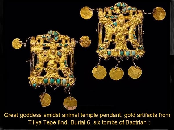آویزه « زیور» طلائی با ابعاد ( ۳۰،۳ × ۴۴،۴) سانتیمتر و تزئین شده با نگین هائی فیروزه ئی، که در آن یک الهه نیمه پرهنه « بداخل معبد حیوانات» بتصویر کشیده شده، که تاجی بر سر دارد و یک شیئی گرد، مانند « سیب یا انار» را در دست چپ خود نگه داشته و با دست راستش پلنگ یا حیوانی شبیه بیک شیر را نوازش میدهد. طوریکه این حالت، روحیه درونی و شجاعت اعشایر کوشانی را نشان می دهد.