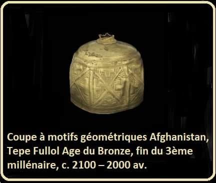 جام طلائی با طرحهای هندسی که در سال (۱۹۶۶م)، از تپه فولول ولایت بغلان در شمال افغانستان امروزی کشف گردیده است.