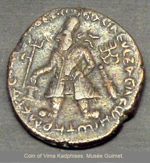 سکه طلائی ویما کادفیزس WimaKadphises (۹۰ ۱۰۰ م )، سومین پادشاه کوشانی که سلف او ویما تاکتو و جانشین او کنیشکا بزرگ بوده است. در این سکه ویما کادفیزس بتصویر کشیده شده و اسم او بزبان آریئو و با الفبای یونانی چنین حک شده است: Οοημο Καδφισης = Vima Kadphises