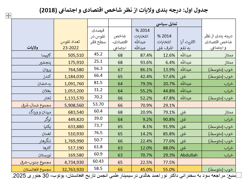 مجموع شمال–شرق (۷ ولایت): جمعیت ~5,908,560؛ درصد فقر = 53.70؛ شاخص اقتصادی–اجتماعی = 66؛ تمایل سیاسی: اکثراً عبدالله